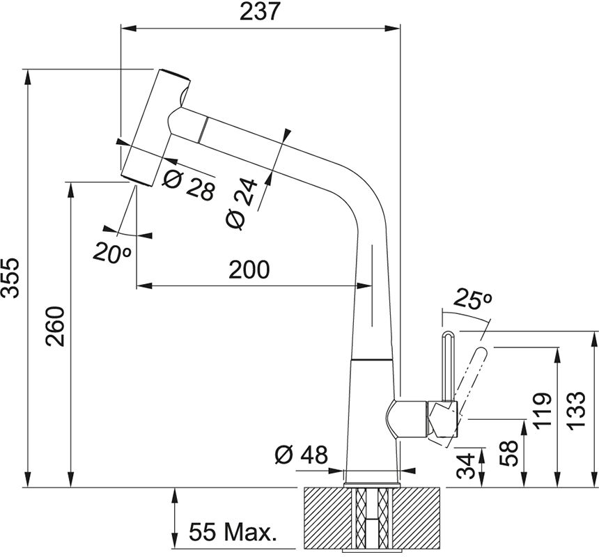 - Минимальное расстояние от стены до центра отверстия 80 мм