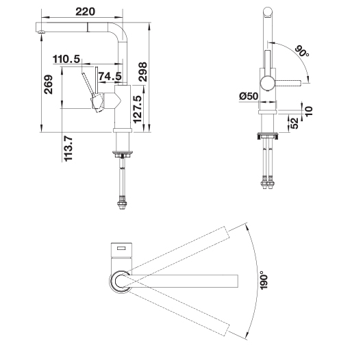 - Угол поворота излива 190°