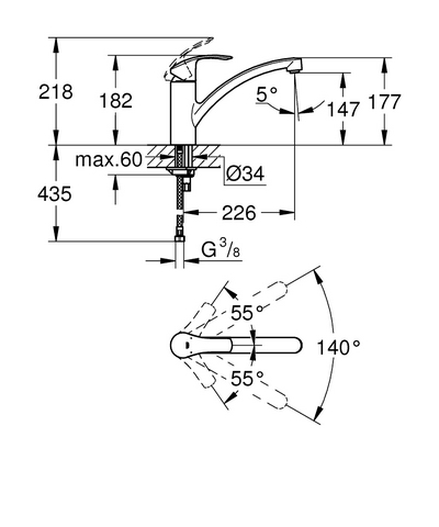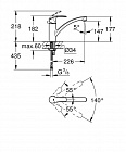 регулировка расхода воды , поворотный литой излив , область поворота 140град.