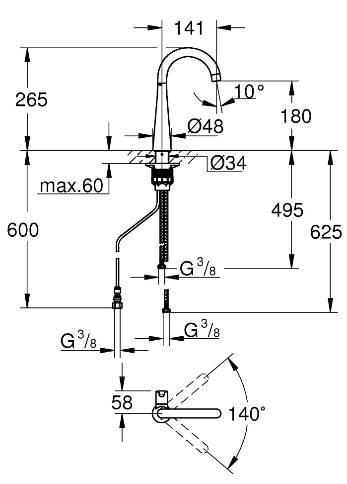 диапазон поворота 140°