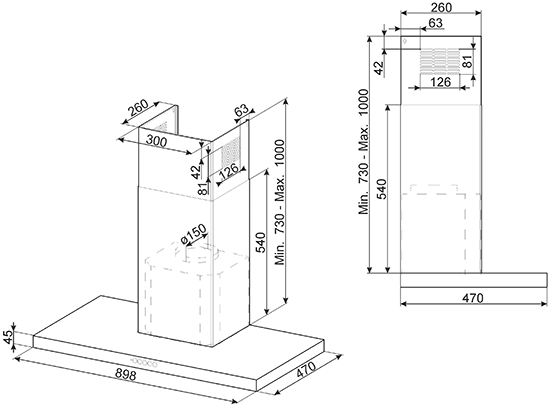 Минимальная высота монтажа над газовой панелью – 650 мм, над электрической – 500 мм