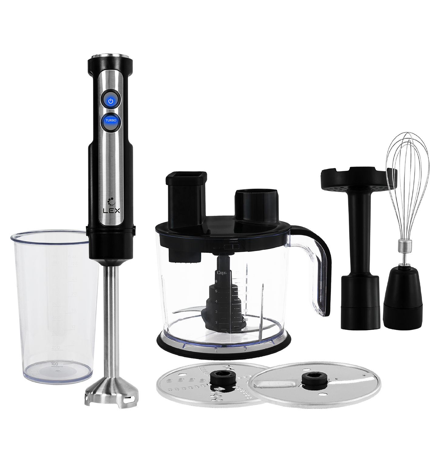 - Комплектация: S-образный нож комбайна, диск для терки, диск для шинковки, моторная часть, насадка для приготовления пюре, насадка-блендер, насадка-венчик, погружная часть и нож