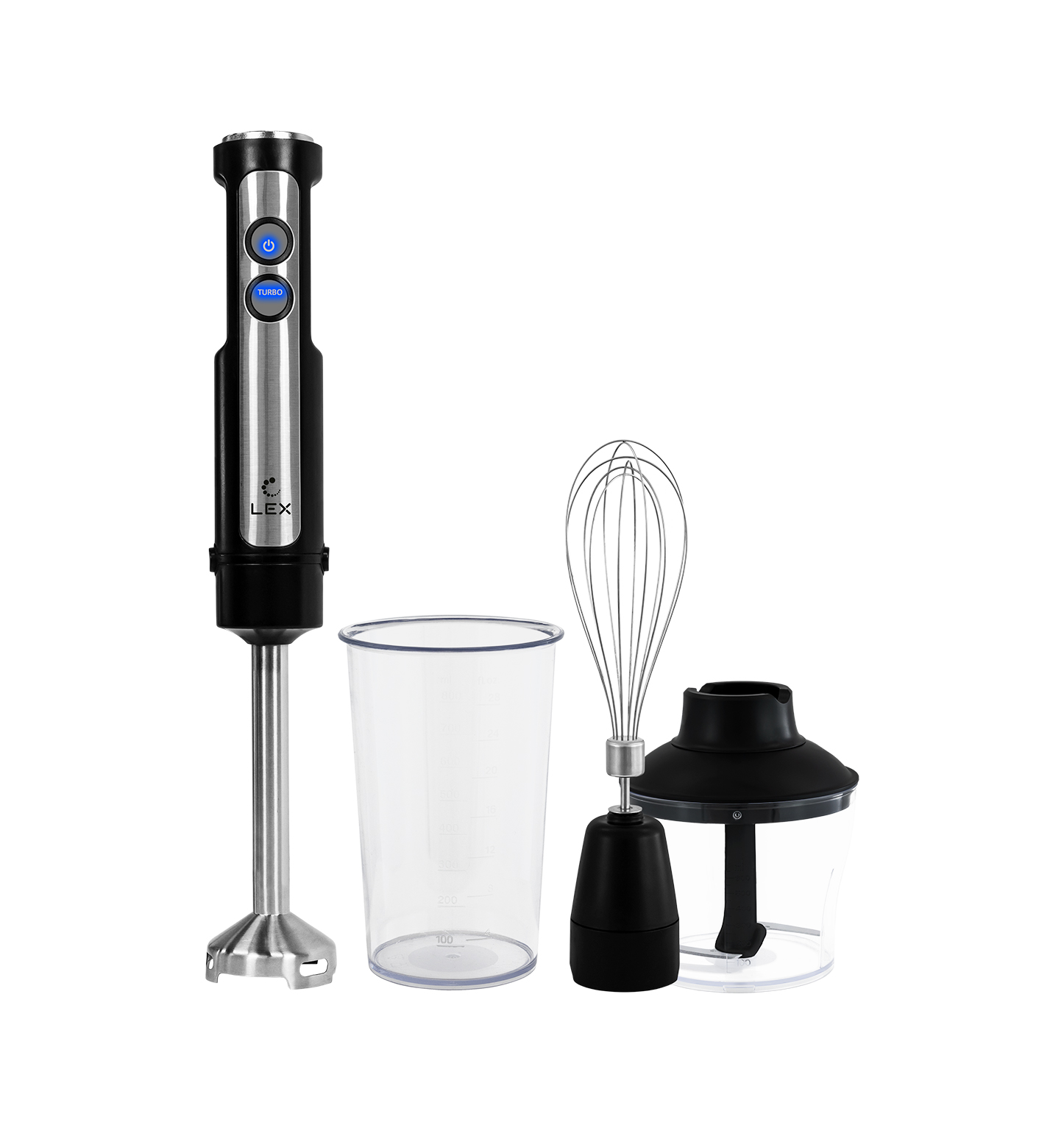 - Комплектация: S-образный нож комбайна, моторная часть, насадка-блендер, насадка-венчик, погружная часть и нож