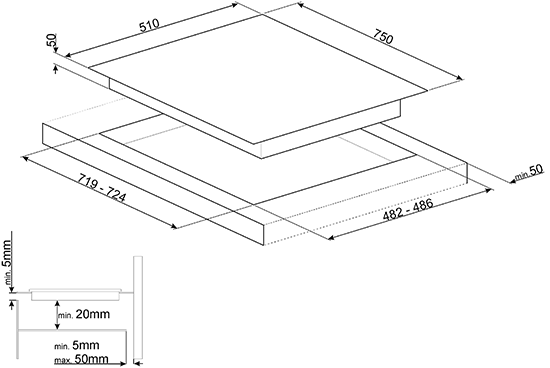 2 индукционные зоны нагрева: Правая - Multizone - 2,1 + 2,1 кВт (Booster 3,6), 460х180 мм