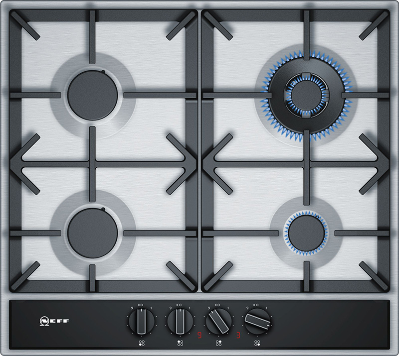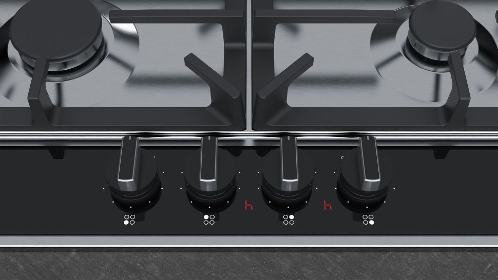 - Тип управления — механический. Пользователь взаимодействует с поворотными переключателями, с их помощью он регулирует мощность пламени. Всего варочная поверхность имеет девять ступеней мощности. Благодаря технологии FlameSelect пламя не затухает даже при работе на маленькой мощности.