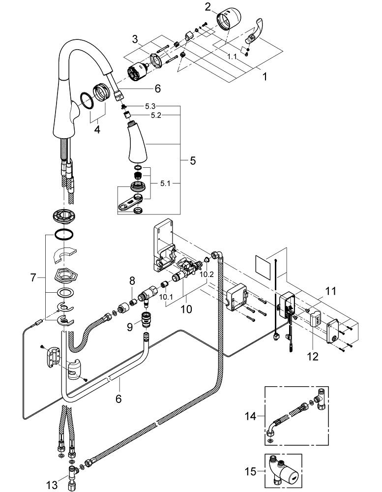 GROHE суперсталь Food control: подача воды с использованием сенсорного датчика Электропитание от литиевой батарейки 6V тип CR-P2 Магнитный клапан Фиксированный расход воды при подаче воды с использованием сенсора Подача воды после 60 сек непрерывной работы (заводская настройка)